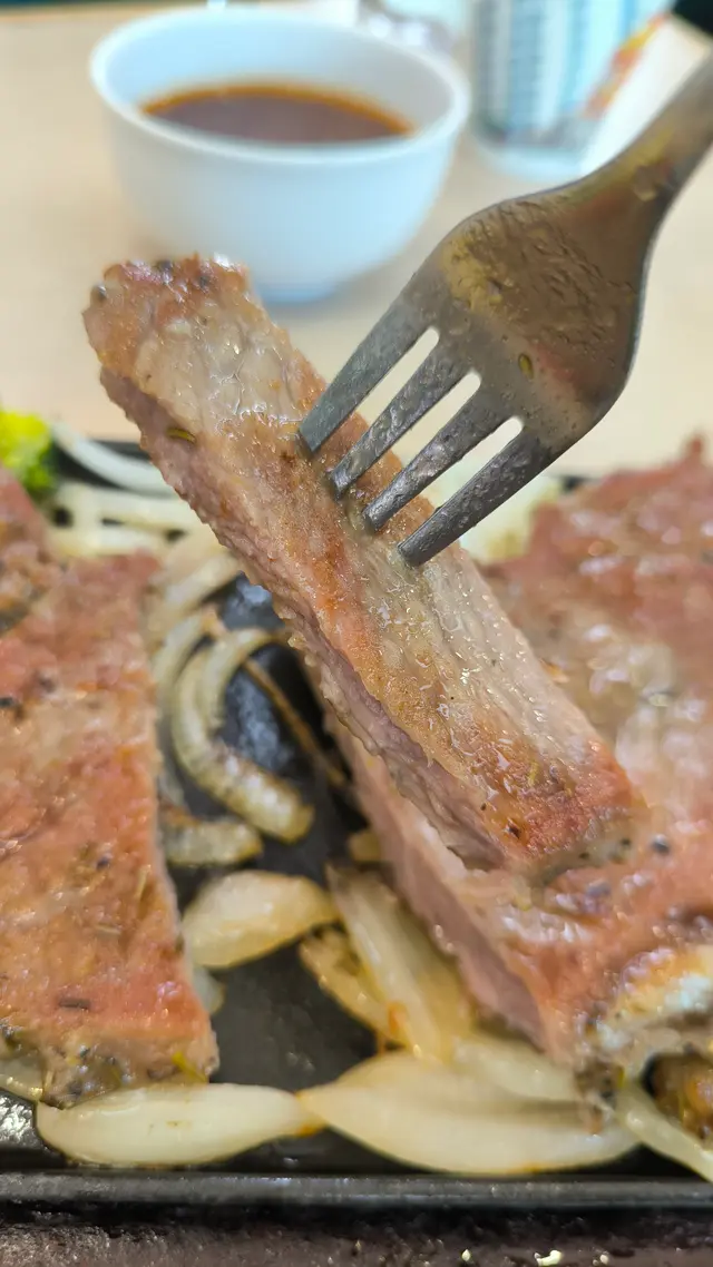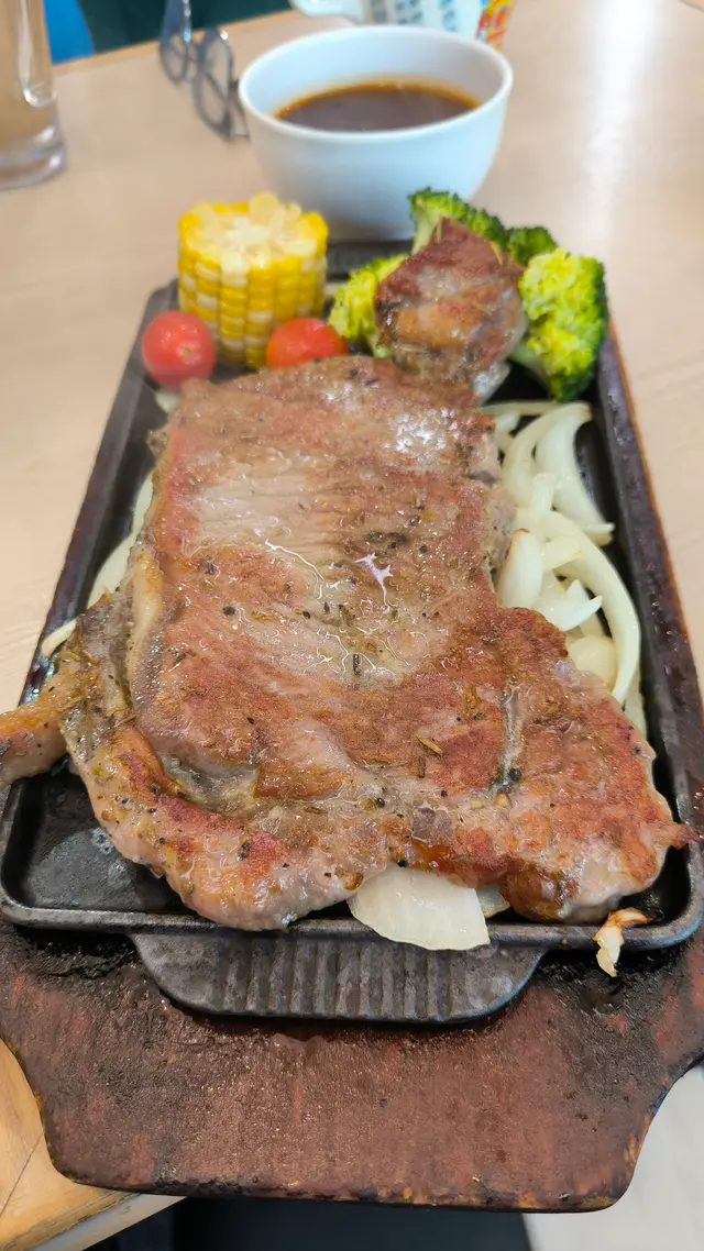 1.鐵板西冷夠鑊氣,蒜蓉汁香惹味!牛扒煎得嫩,咬落有肉汁,配薯條飽肚,抵食又過癮!