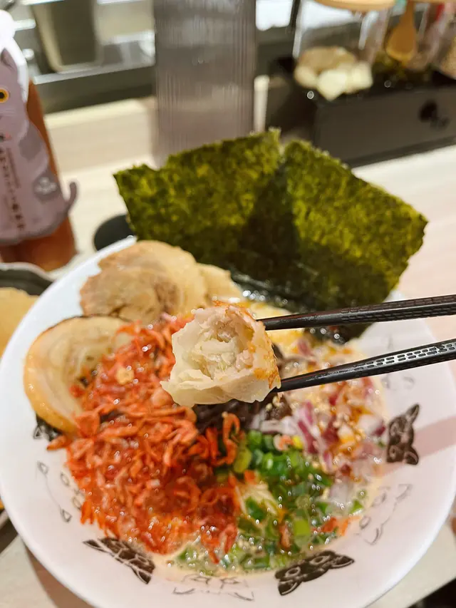 赤雲拉麵:橙紅色的樱花蝦(大量!),青綠的蔥花,紫色的紅洋葱粒,黑色的木耳絲,七彩繽紛鋪滿整個碗面,完全看不到麵條,賣相好看。湯頭的初調是蝦油的香氣,然後是濃厚醇滑的豬骨湯,鮮甜又不過鹹,味道有層次