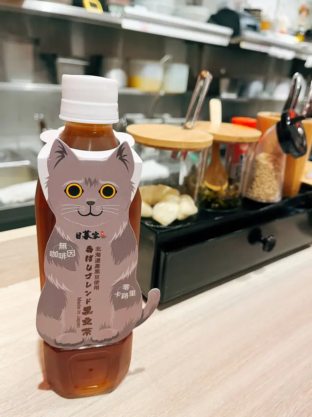 日慕家黑豆茶: 掛在樽頸的小貓紙牌好可愛,背面列出八種材料,當中黑豆和玄米的味道最是突出,口味清新零脂肪,襯相對濃味的拉麵正好