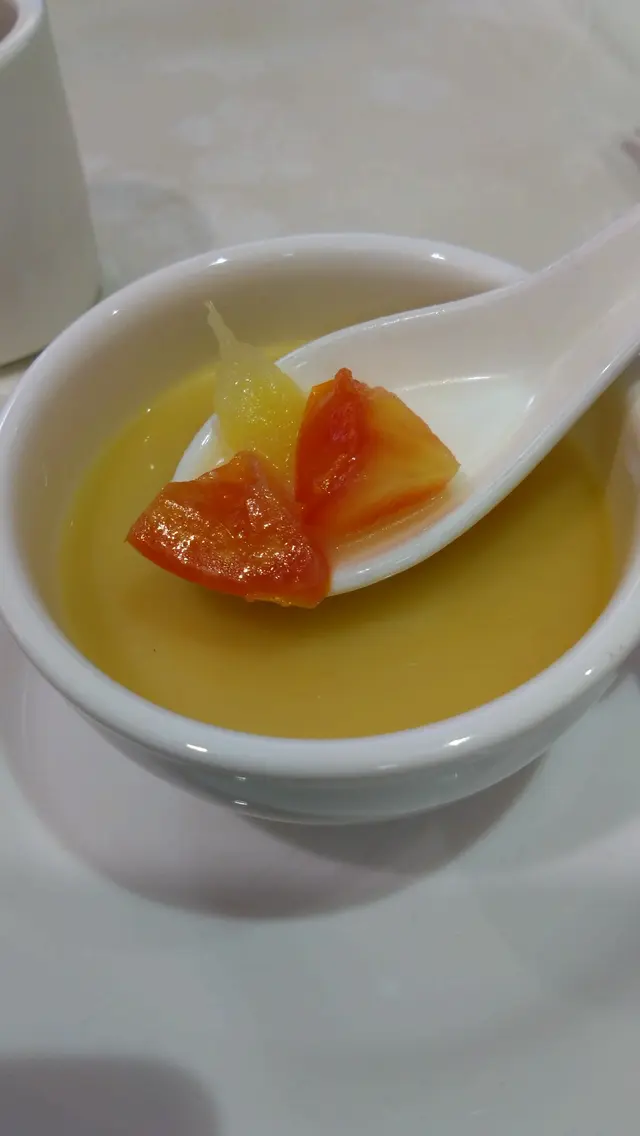 這是店方創意新菜式, 以粥水質地的米湯低溫慢煮,保留其溫熱濕潤,元貝鮮甜肉嫩,跟微鹹的米湯好夾得來!