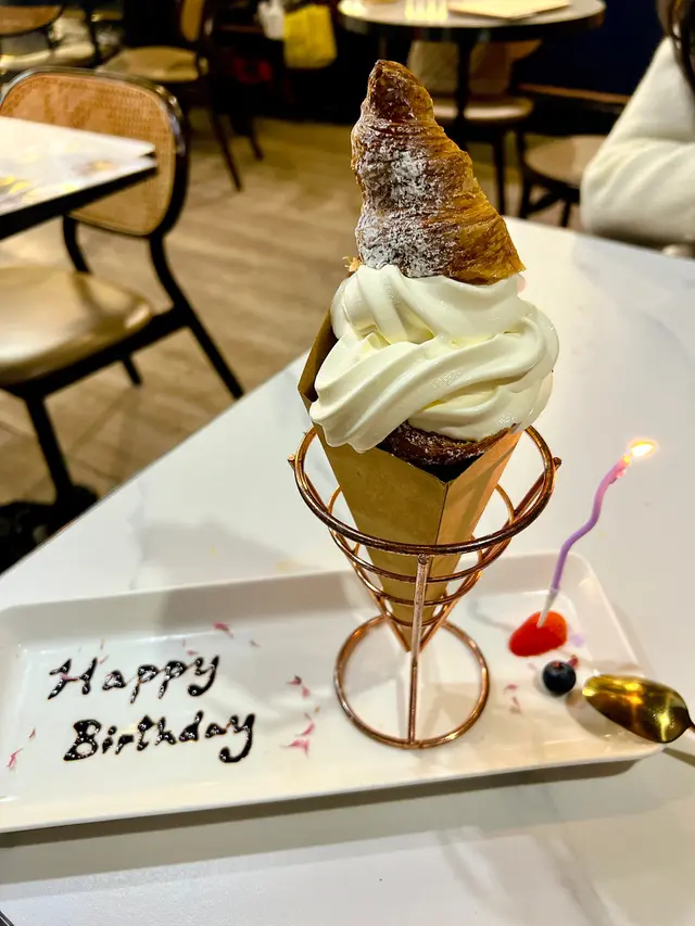 好香濃又幼滑的牛奶軟雪糕🍦,牛角包🥐口感更香脆可口,朋友喺OpenRice訂位時註明慶祝生日,就係隻碟寫上生日字句🥳