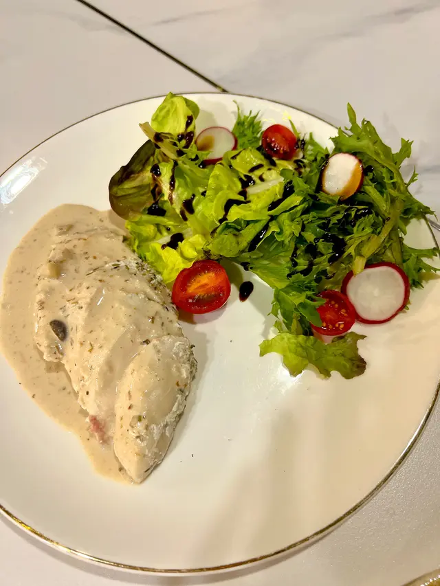 慢煮雞胸肉質鮮嫩,後來發現餐廳比漏左香煎鴨肝,用另一隻碟補返,雞胸併鴨肝一齊食都幾香,仲有沙律菜伴碟