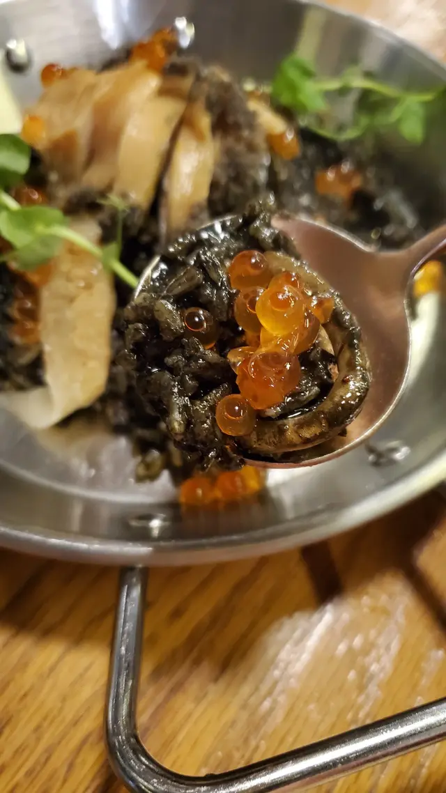 主菜揀呢個墨汁飯絕對冇錯!原隻鮑魚大大隻,爽口彈牙;飯底用墨汁同魚湯熬製,濕潤又Creamy,仲有左口魚、鮮蝦、魷魚圈同爆汁三文魚籽鋪滿面,每啖都食到多重口感同鮮味,視覺同味覺都夠晒享受。