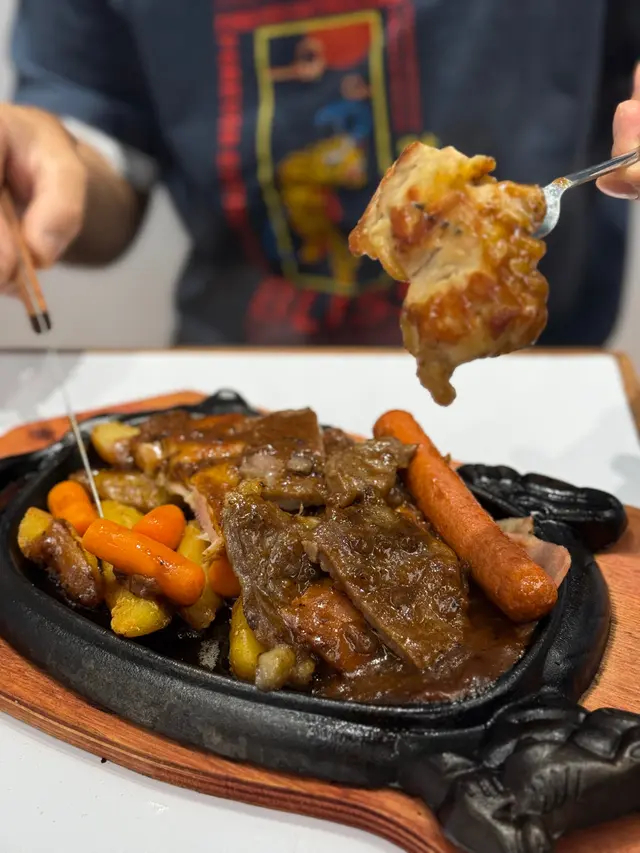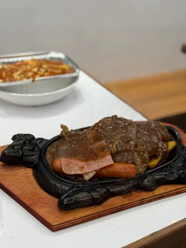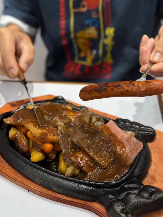 鐵板什扒有火腿、腸仔、煙肉組合,鹹香誘人,配合微焦鐵板香氣。 肉眼扒+雞扒中肉眼扒多汁嫩滑,雞扒香嫩,配黑椒汁提味,香辣中帶胡椒香。 用左黑椒汁濃郁微辣,帶黑胡椒獨特香氣,令扒類更有層次。 羅宋湯酸甜番茄味重,帶豐富蔬菜香,開胃又暖胃。 丹麥多士外脆內軟,黃油香濃,甜甜鹹鹹平衡得好好。 配左意粉 簡單蒜香或番茄味,配扒好配搭。 奶茶絲襪奶茶香滑順口,茶味濃郁帶微淡甜,港式經典。