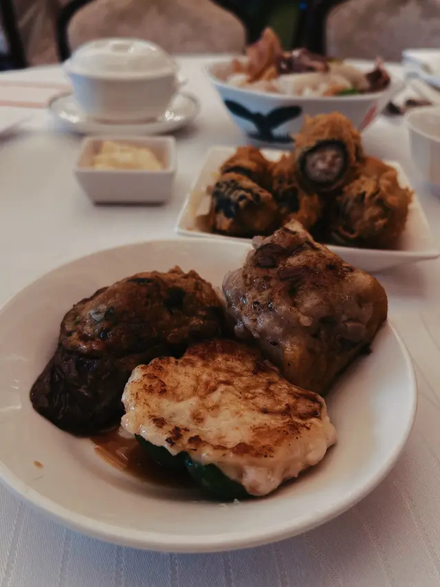 煎釀三寶係港式茶樓同大排檔嘅經典,青椒、茄子同豆卜各自釀入唔同嘅餡料(蝦滑、鯪魚滑、豬肉滑),煎至外皮香脆,內餡嫩滑。