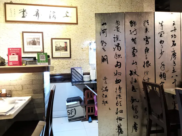 食店是在歌賦街的一間上海菜館,雖然裝潢新中帶舊,有一幅屏風上面題了《滿江紅》的辭,門面內外都帶點懷舊的港式風情,音響中播放著兒時香港流行的粵語時代曲。