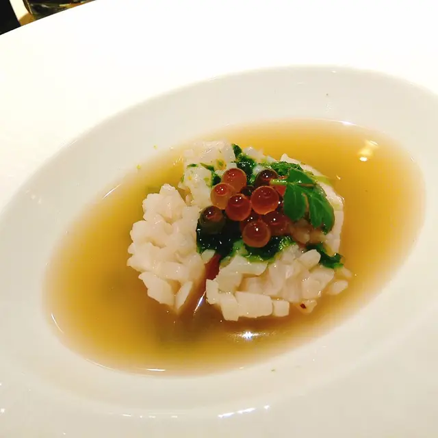清湯帶子 清湯預先用咗鰹魚去煮 好重魚香 又有淡淡煙薰味 搭配上超級巨型帶子 口感彈牙 生熟度啱啱好 加上少少柚子皮 令到成個湯更加清香