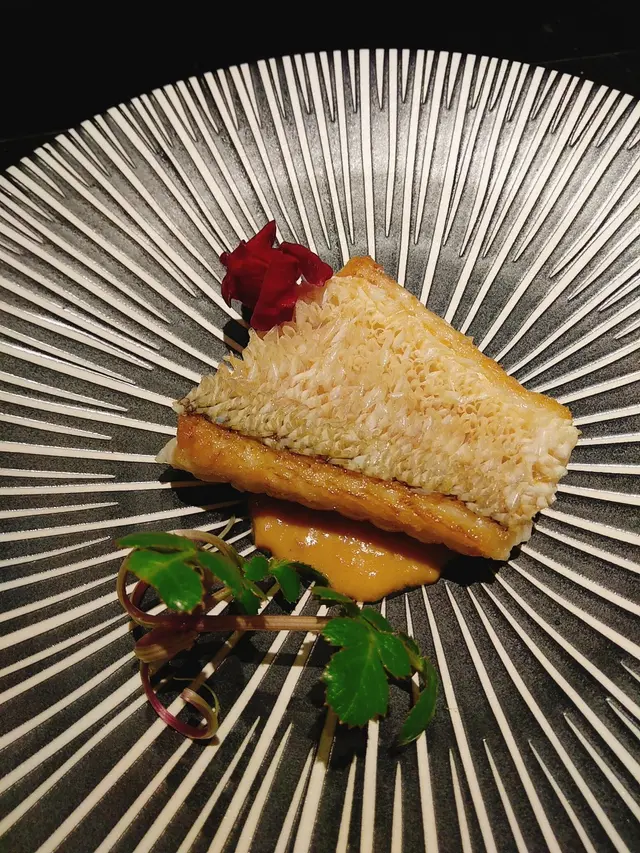 白甘鯛用上罕有金鱗燒既做法 可能大家都對呢個做法比較陌生 因為香港真係好少見 魚肉連皮連魚鱗去煎炸 然後魚鱗就會變得脆卜卜 食落口感非常有層次 而且都係用番魚扒原本有嘅食材 魚肉食落嫩滑多汁火侯控制得剛剛好 再配上好足料嘅海膽去做個醬汁 甘香無比