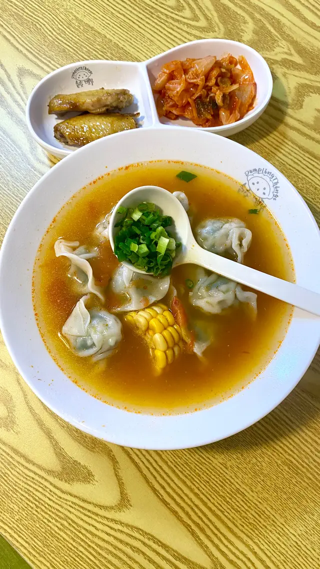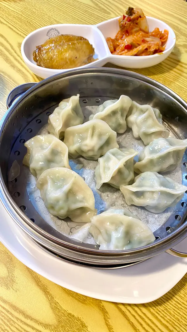 我選咗用蒸嘅烹調方法,熱辣辣以成個蒸籠盛上,夠晒原汁原味,一客有10隻餃子,西洋菜當造,清甜鮮味。微辣嘅韓式泡菜及蒜香雞中翼都幾惹味。