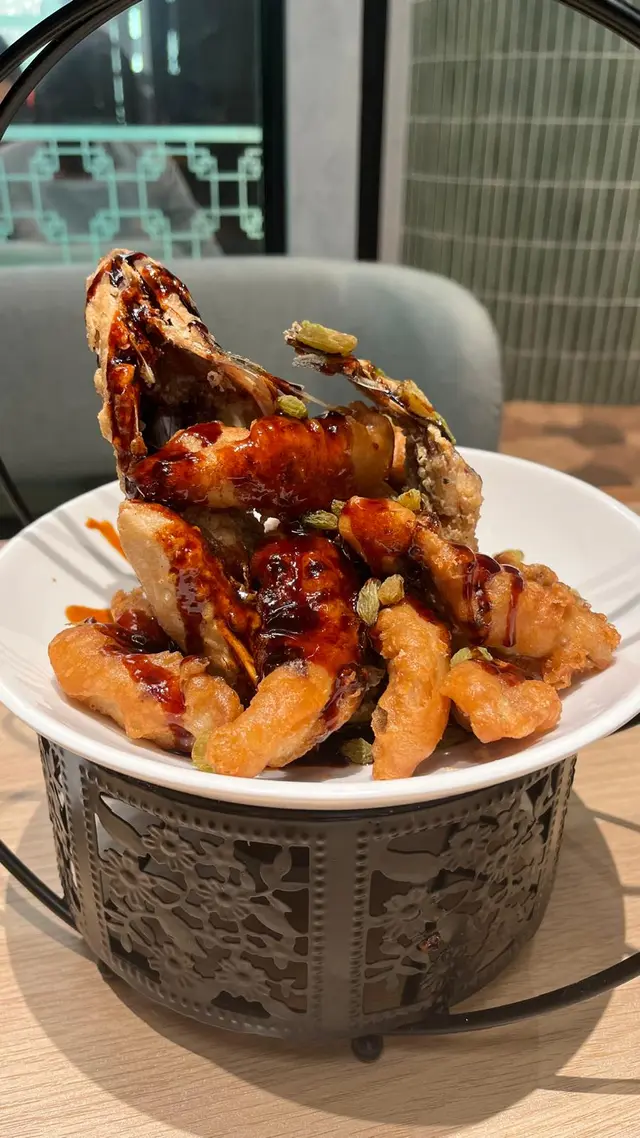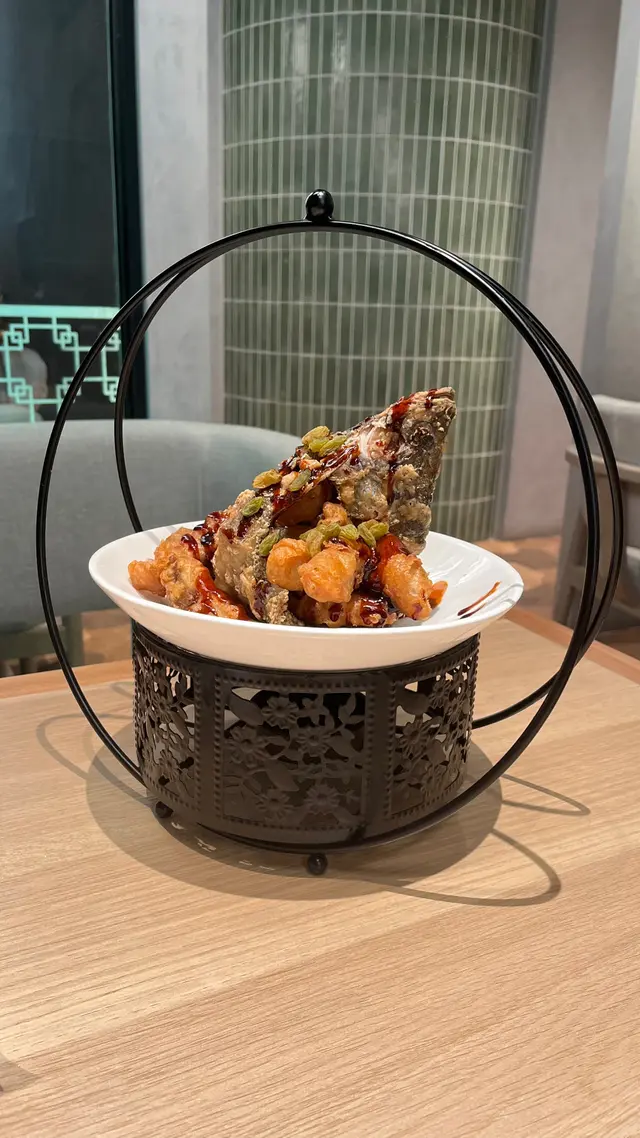 鱸魚已起肉去骨,炸至金黃香脆的魚件,配上酸甜黑醋汁,減輕油膩感。