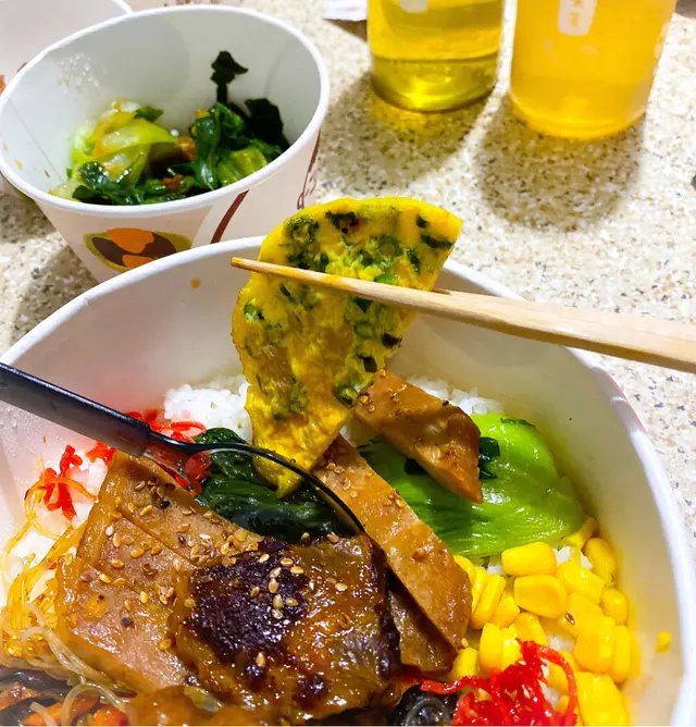 🔸 烤豬肉不會肥,肉質有口感;加上煎蛋角、冬菇、粟米粒、蘿蔔絲、酸瓜、粉絲等配料,款式豐富又健康😉