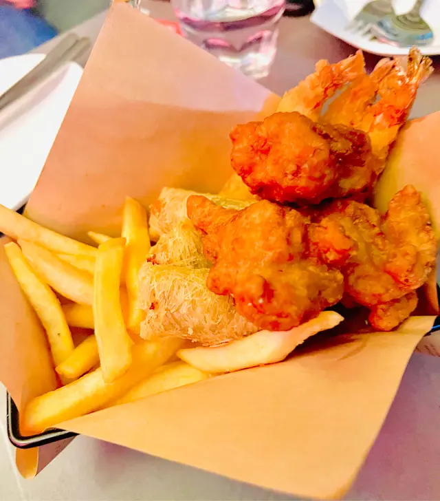 佐酒的好夥伴,炸雞有一點像日式味道的唐揚炸雞,炸粉不算太厚,有一點肉汁;薯條外脆內軟;春卷脆炸;吉列蝦炸得金黃色