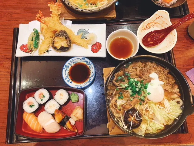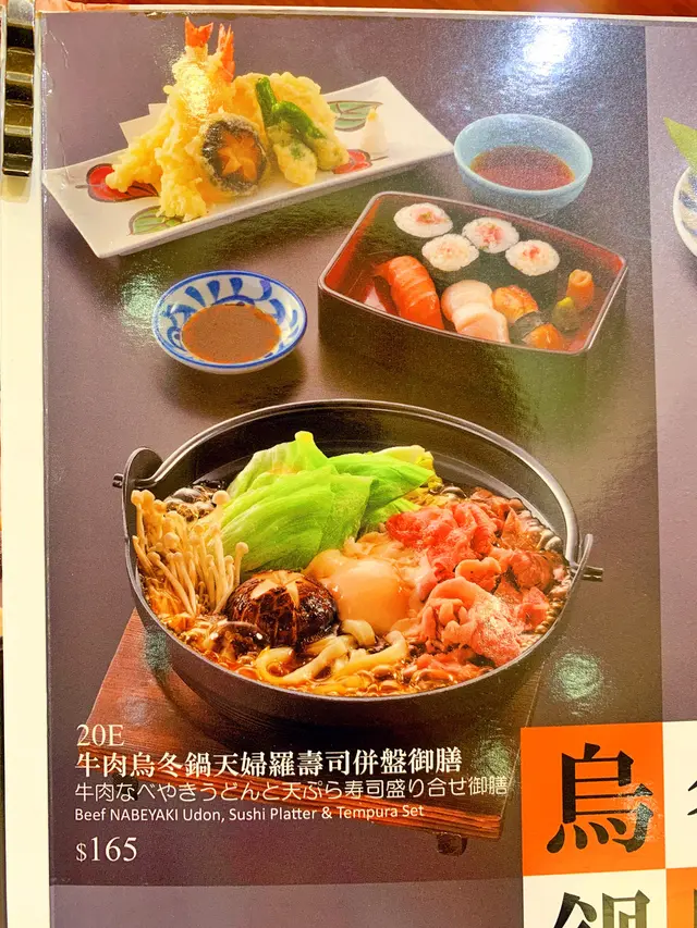 點左個「牛肉烏冬鍋天婦羅壽司拼盤御膳」$165 呢個份量其實對我來講有啲多,但係實在太耐冇出街食飯,真係好想食。