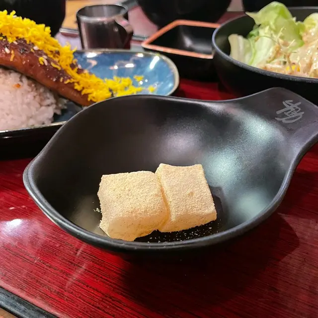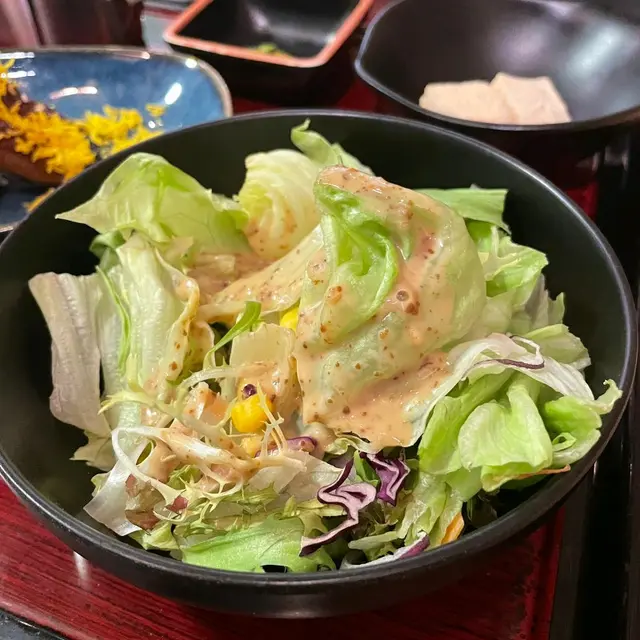 所有定食都會配上味噌湯/前菜/沙律同甜品 沙律菜都好新鮮 加咗芝麻醬更有日式風味🇯🇵而甜品係蕨餅嚟架 煙煙韌韌簡簡單單配黃豆粉已經好好味☺️
