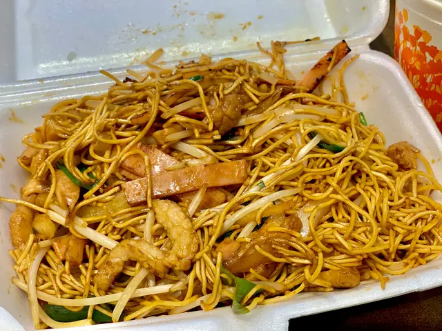材料有火腿絲、芽菜、豬肉絲.麵條爽身彈牙,色澤金黃香脆,鮮濃美味.