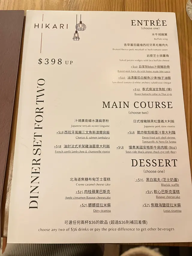 我哋叫左個二人餐,$398起,有小食、甜品,兩個主菜同兩杯飲品,抵到爛🥹另外見到佢新出左個芝士火鍋🫕,但太飽食唔到,決定下次試試!