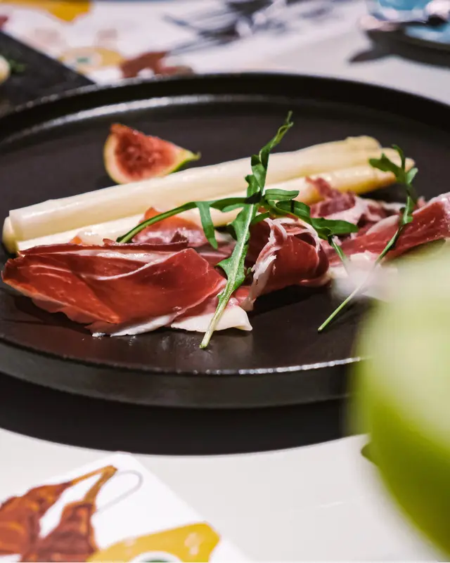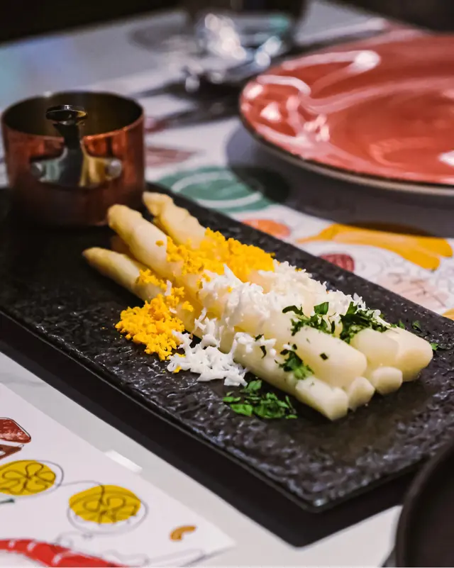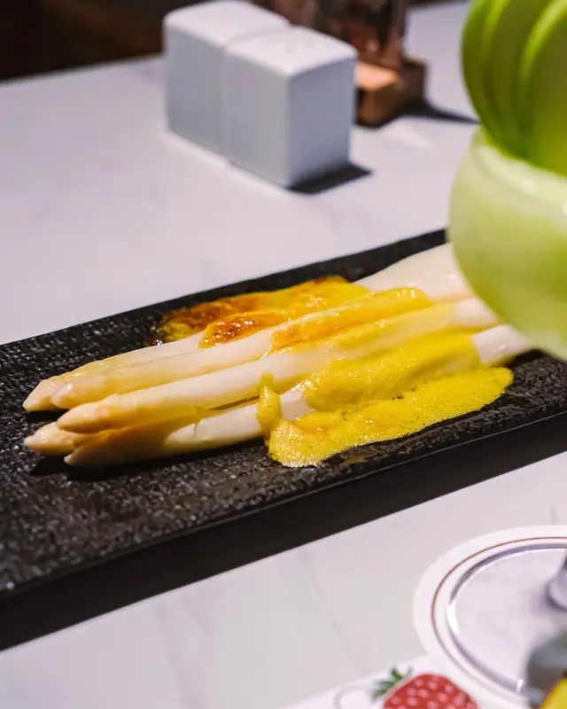 前菜有三種選擇:以新鮮的白蘆筍搭配【伊比利亞火腿/牛油汁和蛋黃/荷蘭醬】,