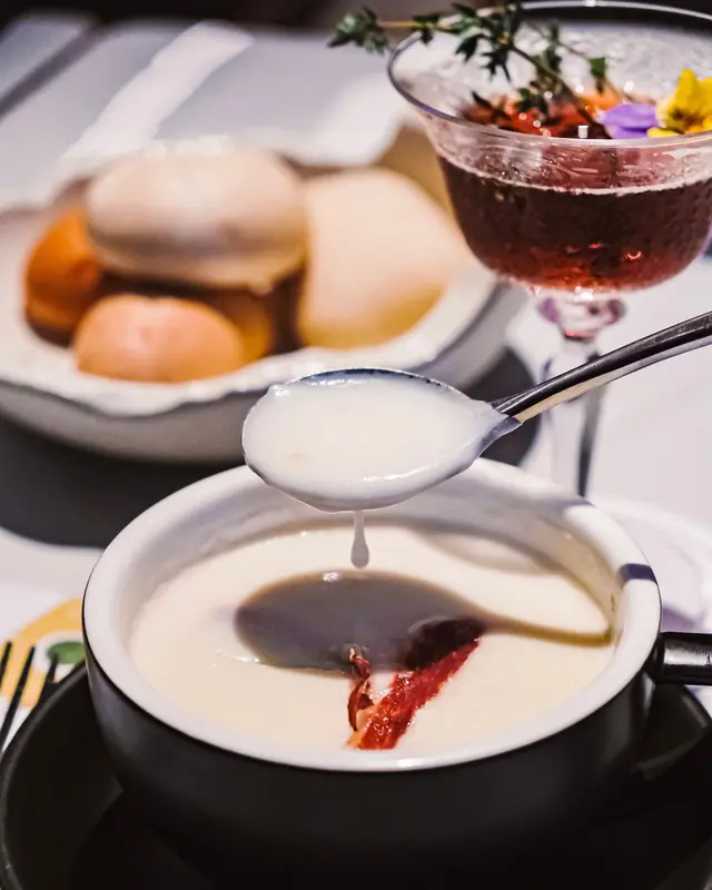 【新鮮白蘆筍忌廉湯配脆煙腿】口感豐富而圓潤,味道搭配上和前菜相似,但以不同的質感呈現
