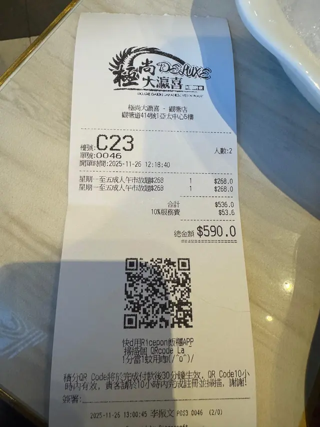 上菜速度快,唔會漏單,環境舒適闊落,平日$268午市放題有呢個質素真係抵到爛!觀塘想歎高性價比高日式放題,極尚大瀛喜實係不二之選,快約埋同事、朋友食返餐勁!😎