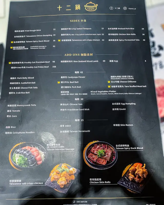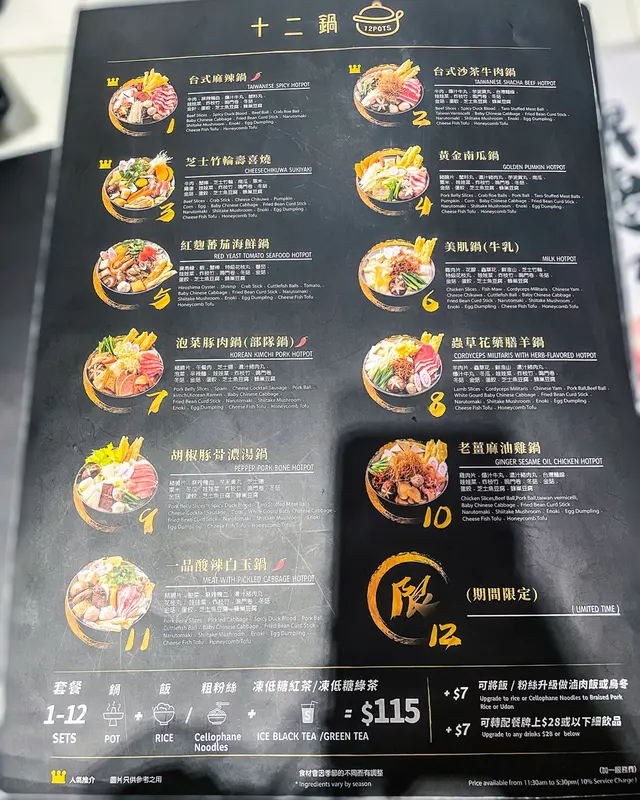 餐牌上有十二款鍋,其中一款係期間限定! 叫套餐價錢係$115,會有一個鍋+飯/粗粉絲+凍低糖紅茶/綠茶。+$7可以轉滷肉飯或烏冬,轉其他台式飲品都可以額外加錢。價錢方面我覺得同其他台式一人一鍋店差唔多👀 我今次第一次嚟食,當然要試人氣推介嘅鍋啦😂 試吓水温先🙊