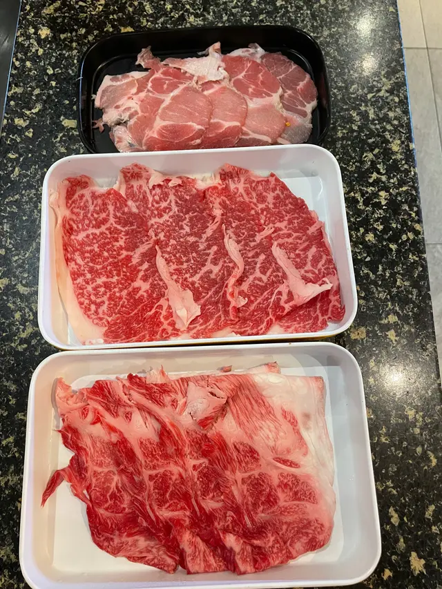 肉類方面,分別叫左A4和牛外腿肉、A4和牛肩、澳洲M5和牛,A4和牛外腿肉牛肉味好濃,估唔到入口好軟嫩。M5和牛就比較瘦,相對冇咁油膩。