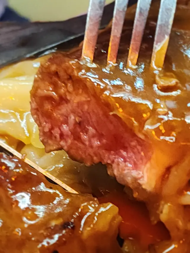 牛扒叫咗5成熟,切開仲保持住粉嫩肉色🔥!表面煎得香口,肉質有嚼勁但唔會韌,黑椒汁濃郁惹味,同肉香好夾~旁邊嘅雜菜同薯條都吸滿肉汁,好滿足!