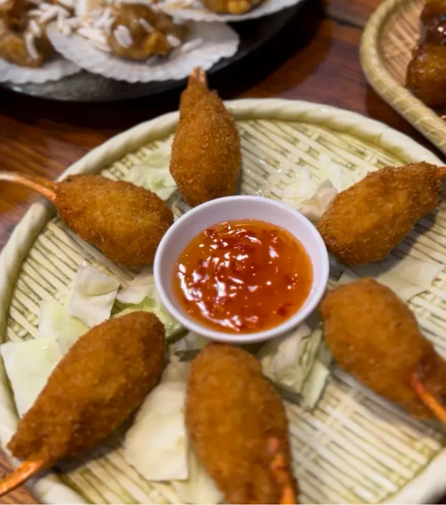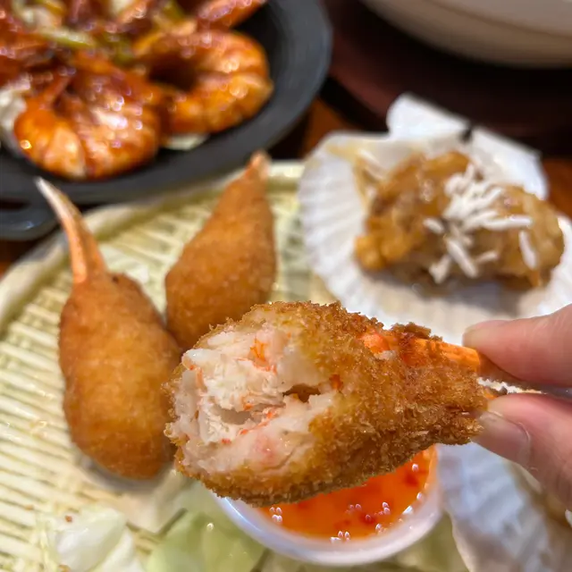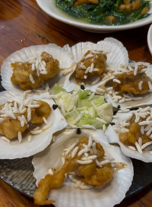 炸元貝配上胡麻醬,清爽解膩,仲有脆米增添口感