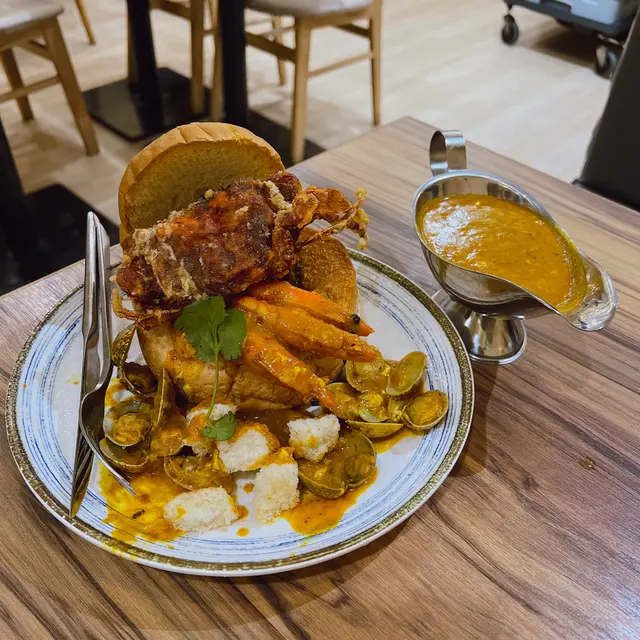 一上枱有d嚇親 因為都幾大份下 2個人都差d食唔哂 入邊有原隻軟殼蟹 大蝦 蜆同青口 再配埋脆卜卜嘅農夫包同新加坡辣椒蟹醬食落好惹味!!