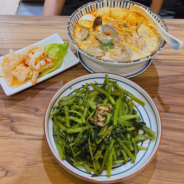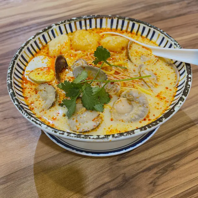 湯底好濃椰香同海鮮味 仲帶點香辣 仲有帆立貝 蜆 同索哂湯汁嘅豆卜 麵底就係油麵同米粉混合 一入口有2種口感咁幾得意