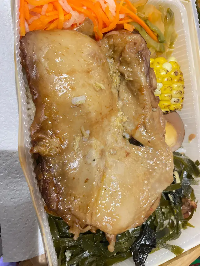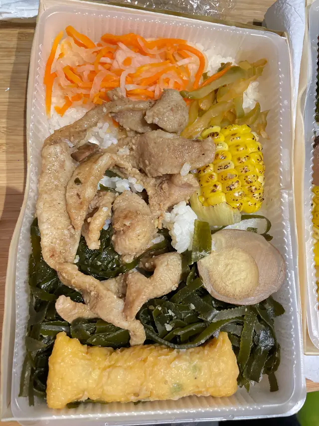 除咗主菜嘅肉類之外,每個飯盒都會有配菜如滷水蛋、燒粟米、酸蘿蔔、海帶絲、榨菜等等,更附有豉油調味及餐具添!