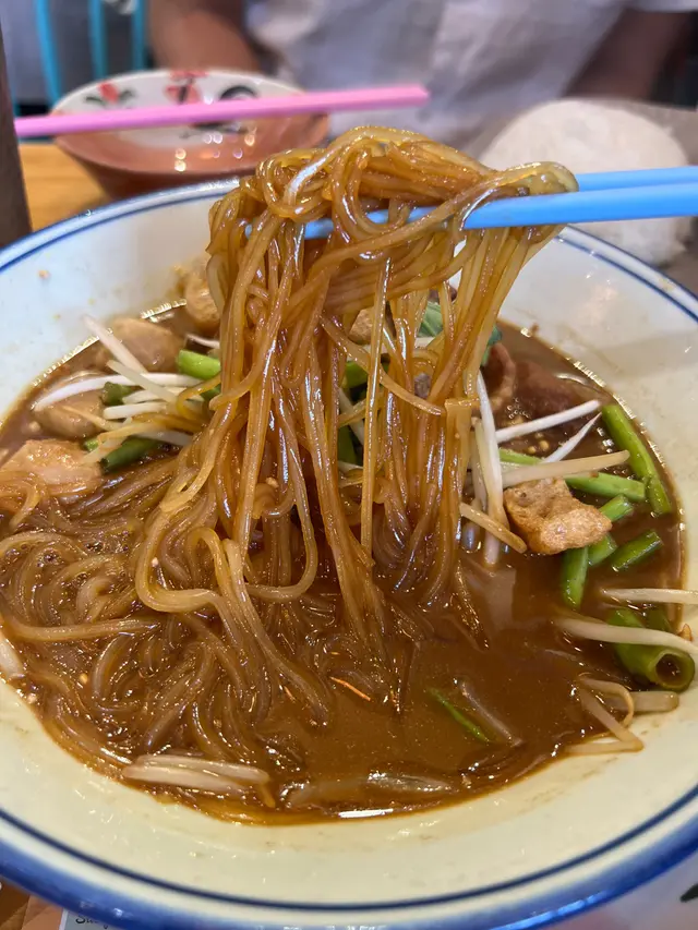 佢地既船麵係用新鮮牛骨湯配牛肉及牛丸,附有芽菜,通菜,花生碎及炸豬皮,牛湯味就濃郁,牛肉係牛腩黎既,幾嫩口,個炸豬皮就好出色,麵底可以有唔同選擇,我地就揀左金邊粉🍜