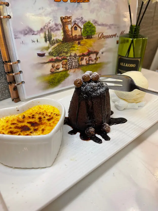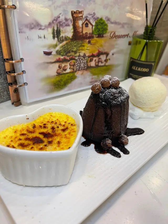 甜品屋都係應該食糖水。第一款點咗其實係雪糕加焦糖布甸同埋心太軟。雪糕都有幾款味道,我哋記揀咗雲呢拿~ 上枱時心太軟外表精緻,切開有流心情況,朱古力慢慢咁由入面流出黎。內裡嘅蛋糕都算綿密細膩。算唔錯~