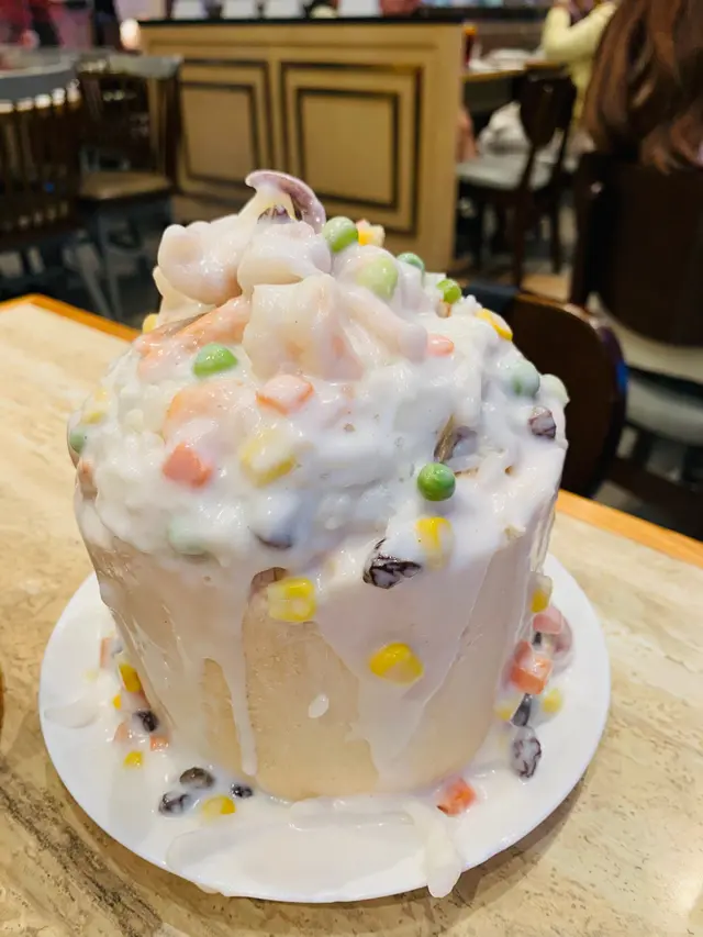 配料亦非常豐富:大蝦、墨魚仔、粟米粒、青豆、提子乾、紅蘿蔔粒。