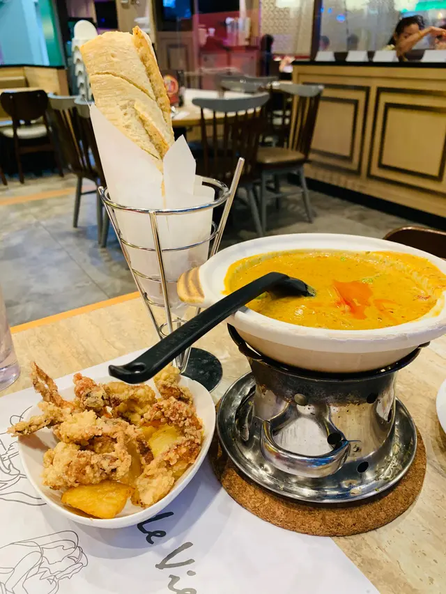 首先要講講個法包,並唔係普通麵包店買既硬弸弸法包,而係外脆內軟,法包入面好軟熟,仲要係熱既,再淋上咖喱汁食,法包吸滿咖喱香味,微辣小小甜甜地,非常唔錯。而軟殼蟹亦炸得好香脆,咬落仲有蟹肉汁。