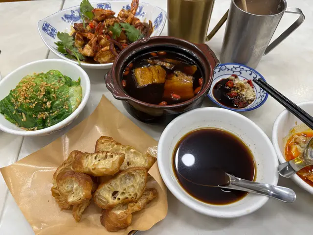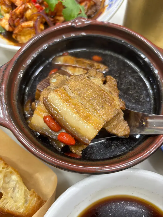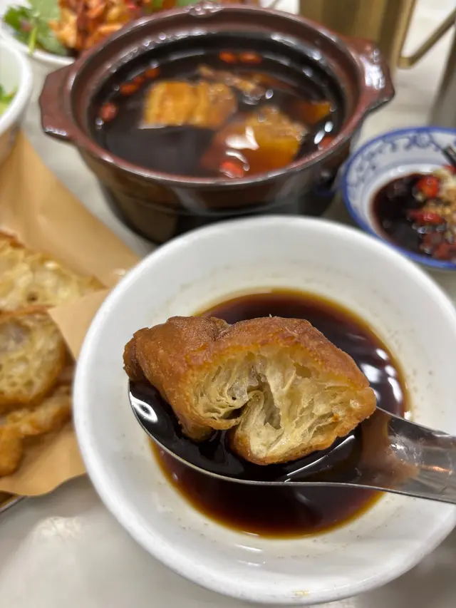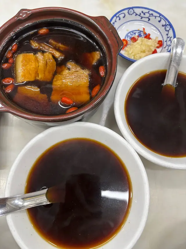 接下來是 **三層肉**肉骨茶,這道菜層次分明,外脆內嫩,肉汁滿溢,吃一口就讓人愛上!湯底濃厚,還帶有淡淡的藥材香,配上油炸鬼,味道獨特,真的是一絕!🍖