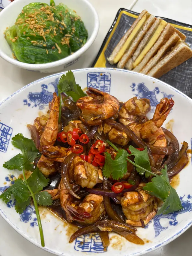 然後是 **甘香虎蝦**,外殼酥脆,裡面的肉質柔軟彈牙,搭配的醬汁和辣椒、芫茜,簡直讓人忍不住一口接一口!🌶️