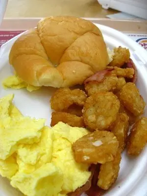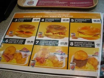 這時這刻還是刻意到機場的禁區吃burger king~很老土是吧?haha~但多年來的傳統~始終習慣了就是習慣了~~就算是早餐時段~regular meal和breakfast menu也同時供應~~早上吃不得一點肉的小比就選擇了簡單卻水準易有差異的熱香餅餐~而大比就要了個煙肉炒蛋薯波”牛角型麵包”餐