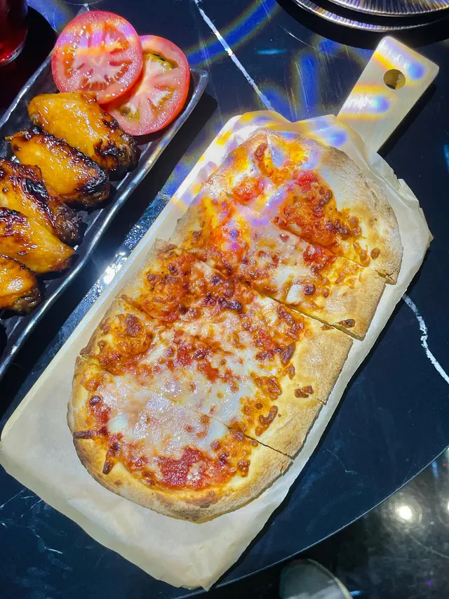 瑪格麗塔薄餅(單點$108),表面鋪滿Mozzarella Cheese、番茄蓉、番茄醬,味道鹹香,略嫌沒有羅勒,薄餅脆邊口感香脆,批底麵團似熟未熟,口感煙韌。