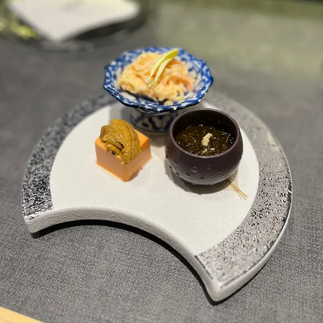 前菜三品:水雲、蟹肉配蛋黃醬、海膽豆腐
