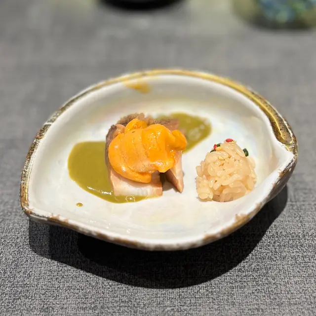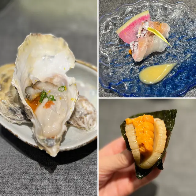 刺身:長崎蠔、⭐️真鯛薄切配赤海膽、燒帆立貝配馬糞海膽