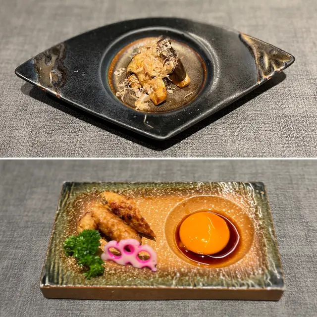 料理:鹽燒松本茸、阿波美雞免治雞肉棒配刺身級太陽蛋