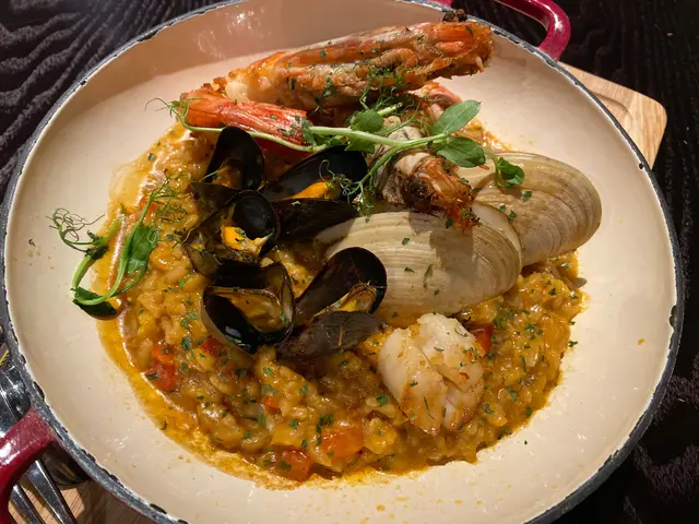 法式海鮮燴意大利飯用上鑄鐵鍋原鍋上,打開鍋蓋意大利飯上鋪滿大蝦,青口同大蜆已經好吸引.底下燴意大利飯用上龍蝦湯燴,每一啖入口龍蝦味好濃.意大利飯煮得夠濕潤唔會乾爭爭,咬落口脹卜卜又帶點煙韌.