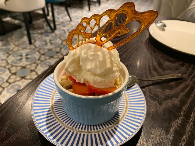Apple crumble配雲尼拿雪糕,雲尼拿雪糕上加上麥芽糖配飾好有心思.自家製雲尼拿雪糕同牛奶味平衡得好唔會搶過各自既味道,apple crumble內裏暖笠笠,將微酸既焦糖蘋果及香脆牛油麵粉加上雪糕帶出3重味道感受.