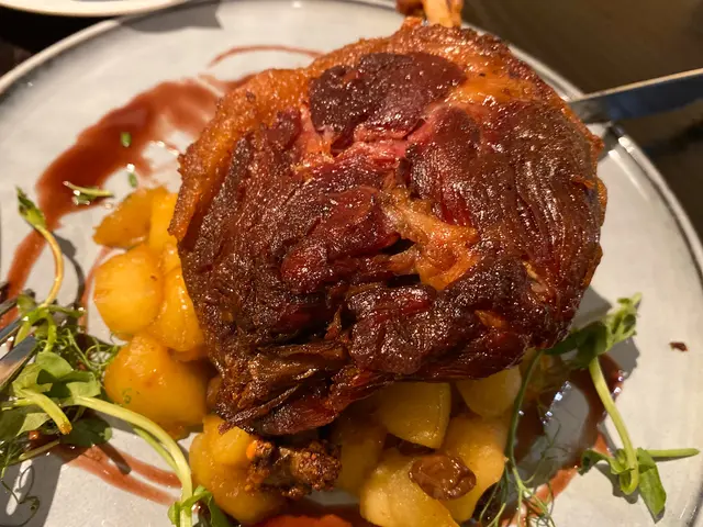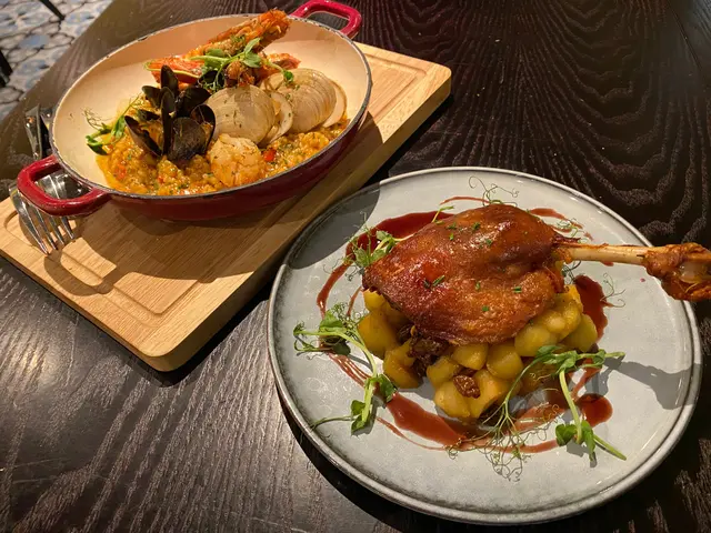法式油封鴨配焦糖蘋果,油封鴨作為法國名菜之一當然點黎要試下大廚既功力.油封鴨腿外層鴨皮係烤焗既時候已經將鴨皮大部分油份迫左出黎,入口香脆之餘亦唔會感到好油膩.內裏鴨肉唔鬆散,肉質柔軟且結實,充滿鴨油香又不膻,味道亦唔會過鹹.店內拋開以薯仔做底既傳統將其換成甜甜酸酸既焦糖蘋果以平衡返油封鴨既油膩感.