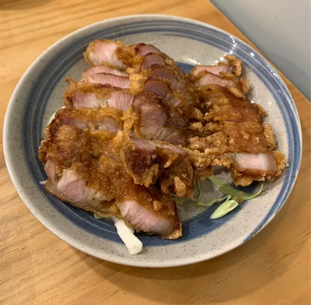 五花腩厚度很適中,外皮炸得金黃香脆,雖然說是五花腩,但沒有多餘的肥油,不會吃到整個口都是油脂,很鬆化。