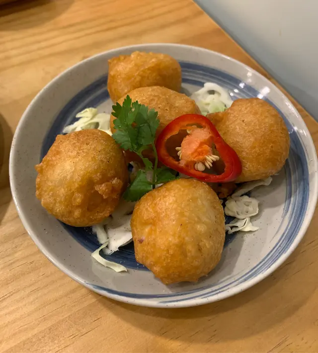 一份碟有四大粒花枝丸,炸得金黃色,內裡很像墨魚丸的質感,彈牙有口感。