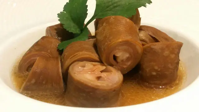 這九轉小腸是一道非常考功夫的菜式。首先把小腸清洗得非常乾淨, 然後把小腸反轉塞入, 做到九層的效果。重點是重覆穿套又要套得夠結實才不會散開, 真的不太容易。單看這九層的小腸已經吸引。