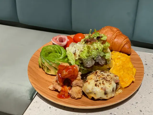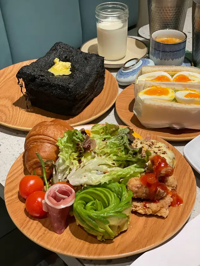 賣相不俗的全日早餐,擺盤方式與咖啡廳無異,還以為自己在咖啡廳呢~食物種類繁多,有家傳酥炸咕嚕肉、芝士煙肉洋蔥大啡菇、西班牙火腿、炒滑蛋、牛角包、車厘茄和黑醋沙律等,包含多國美食呢~