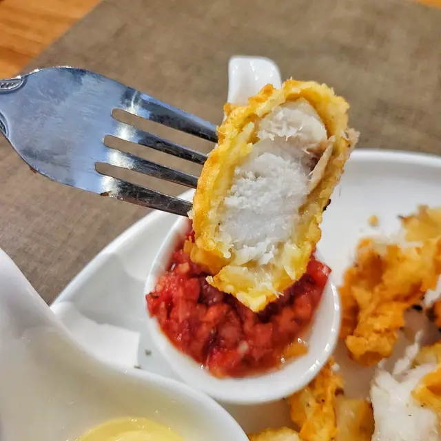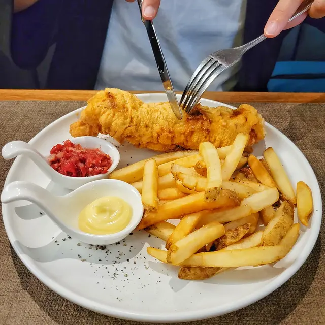 連皮薯條外脆內軟,炸得火喉剛好🐟炸魚的炸漿混了黑椒,炸皮有點韌力,魚肉質地彈牙