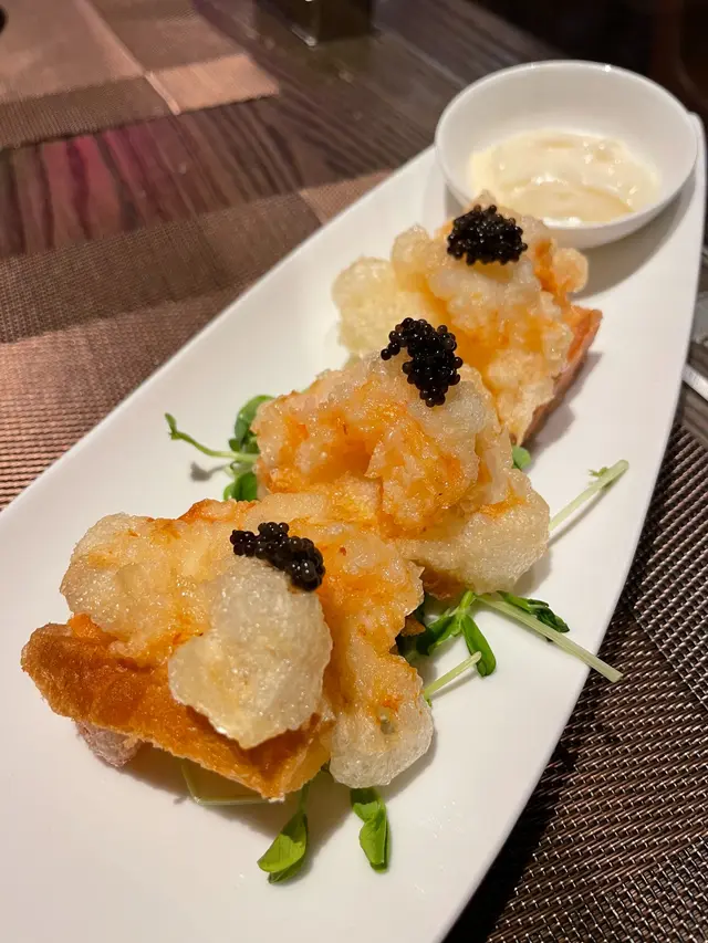 酥脆可口的蝦多士,竟配上名貴的魚子醬,甚有氣派。不過炸多士時,油温可能不夠高,所以油份未能完全逼出來,但味道也是不錯的哦。